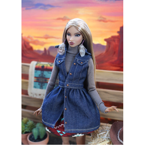 Long sleeve taupe knit bodysuit. Turtleneck with snap closures in back. Short gathered cotton knit skirt in maroon SW print. Snap closure in back. Dark denim vest. Snap at waist with long, gathered bodice. Copper button accents. Real feather earrings.