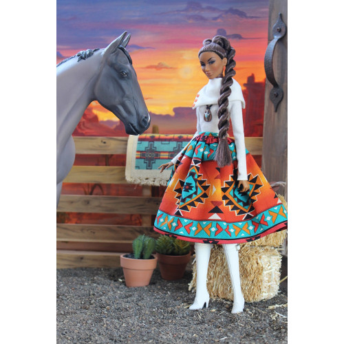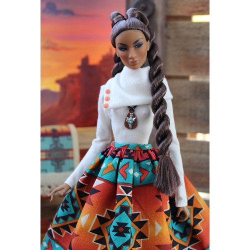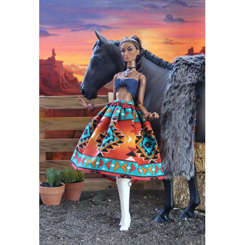 Dark denim 'bow' tube top with two snap closures in back. Cream knit long sleeve bodysuit. Large fold-over neck cuff with orange button accents. Snap closure in back. Long faux fur stole, lined with orange SW print. Orange SW print cotton skirt. Gathered waist and mid-calf length. Snap closure in back. Two copper beaded cuff bracelets. SW arrowhead charm necklace.