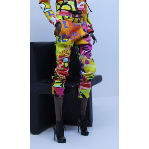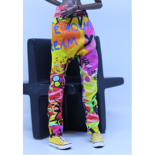 - Custom printed graffiti print knit harem style jogger pants. Wide waist and leg cuffs. Side seam pockets.