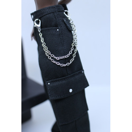 - Black twill pants. Fitted waist with extra long, baggy fit legs. Working front pockets, side cargo pockets, and back pocket flaps. Silver button and rivet accents. Removable double strand silver chain with bull snaps.