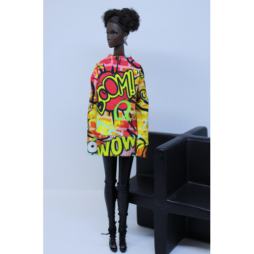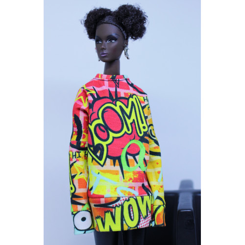 - Custom printed graffiti print knit drop-shoulder sweatshirt. Wide waist and sleeve cuffs. Snap closures in back.